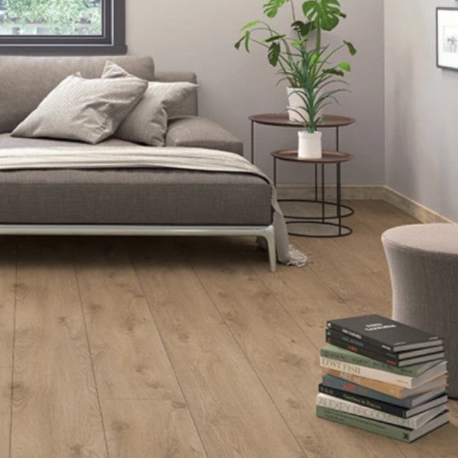 Elevate your home with the natural warmth of AGT Effect Solaro. This 8mm laminate floor features a rich oak-inspired finish with precise register embossing, delivering authentic wood grain texture and a lifelike appearance. The 1200mm x 191mm planks allow for a smooth and continuous layout, perfect for open-plan living areas, hallways, and bedrooms. Solaro’s warm tones bring a cozy, inviting atmosphere while remaining versatile enough to complement modern or traditional interiors. With an AC4 wear rating and a 20-year residential warranty, this laminate floor provides durability and easy upkeep, making it ideal for busy households. Stylish, practical, and affordable, AGT Effect Solaro is a dependable choice for timeless wood flooring aesthetics.